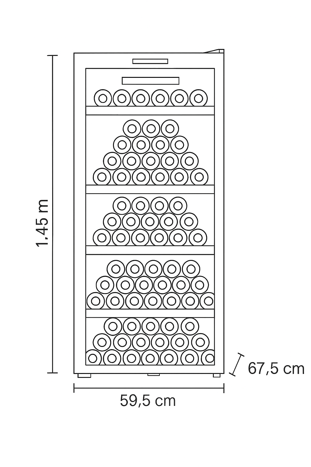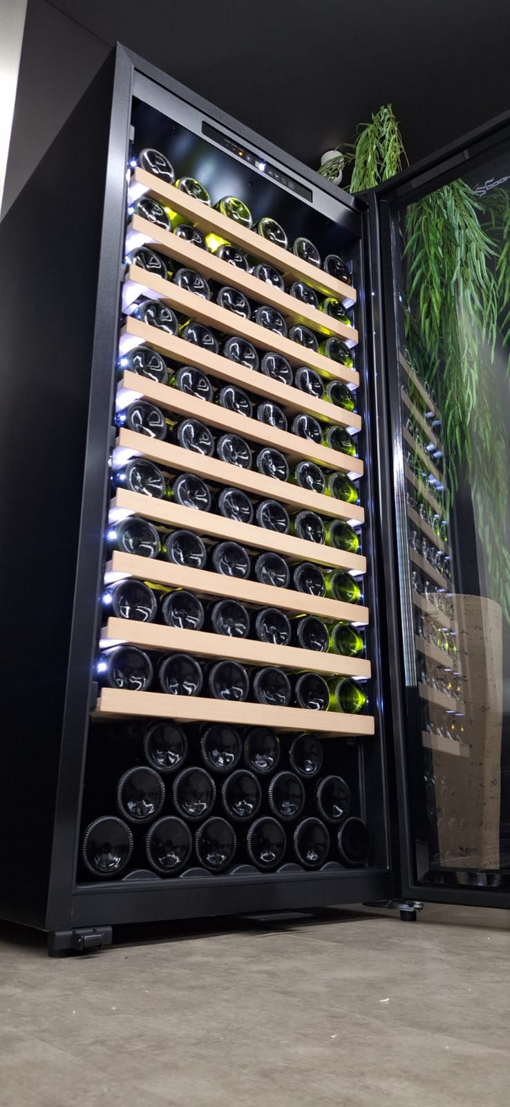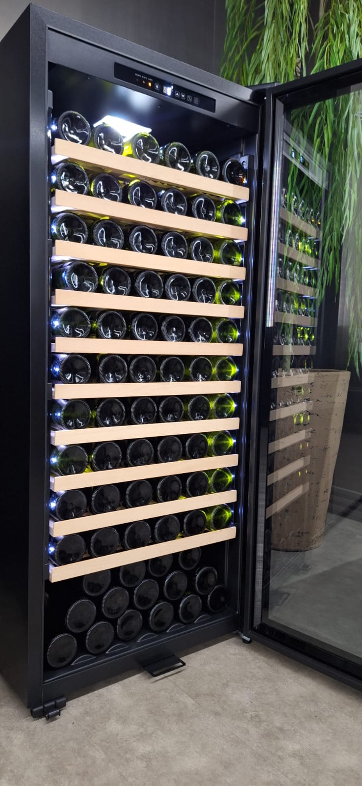 Com capacidade nominal para até 155 garrafas padrão Bordeaux (750 ml), conta com prateleiras de madeira deslizantes, iluminação interna em LED branco, painel eletrônico de controle, sistema de refrigeração por compressor e porta com vidro tratado contra raios ultravioleta, que protege os vinhos da luz externa.