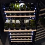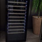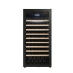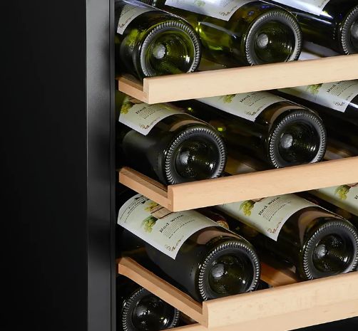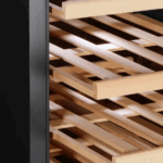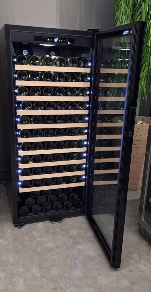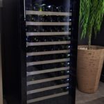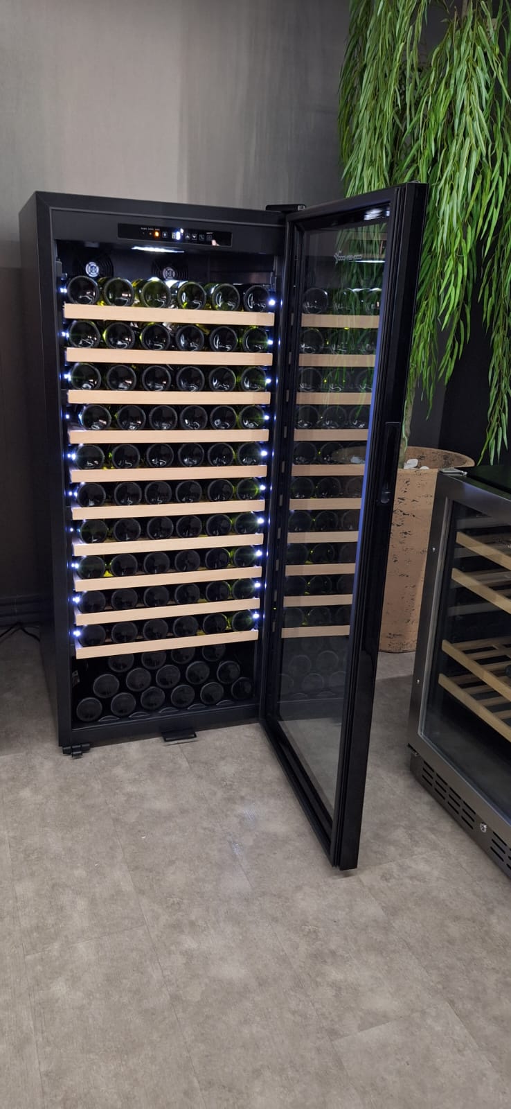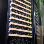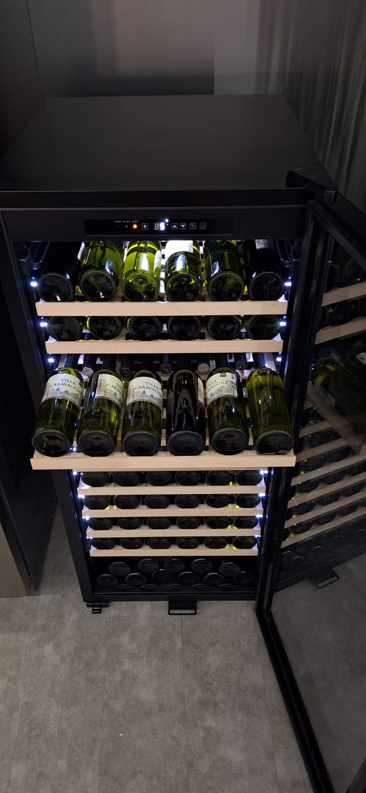 Com capacidade nominal para até 155 garrafas padrão Bordeaux (750 ml), conta com prateleiras de madeira deslizantes, iluminação interna em LED branco, painel eletrônico de controle, sistema de refrigeração por compressor e porta com vidro tratado contra raios ultravioleta, que protege os vinhos da luz externa.